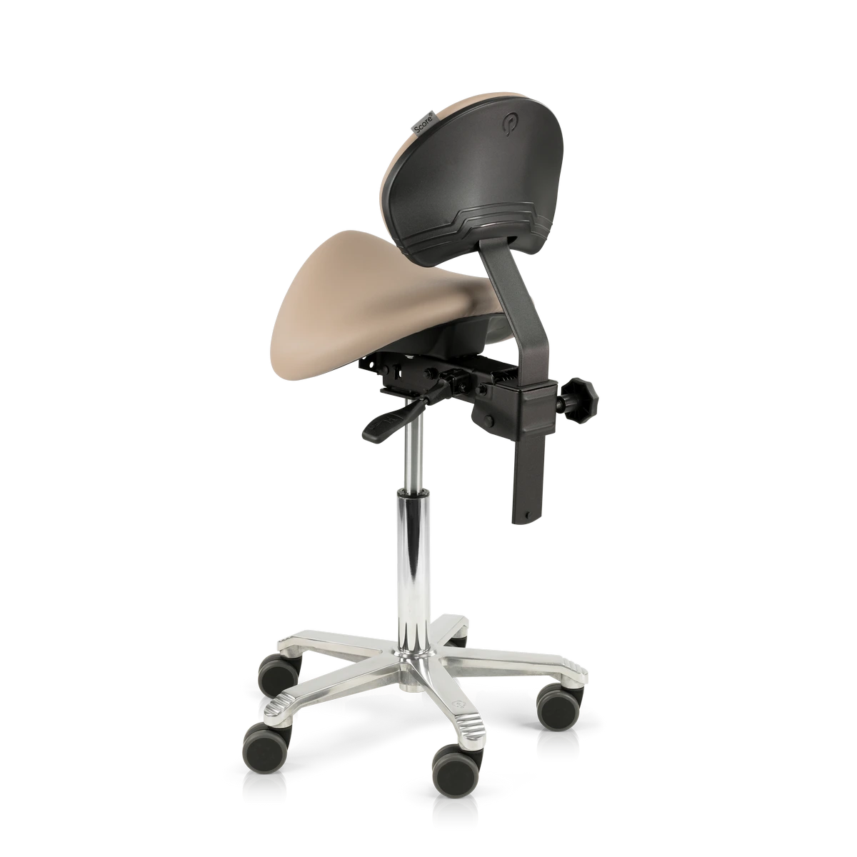 The Score Jumper with lumbar support seamlessly upholstered is an ergonomic saddle stool with hygienic upholstery. The saddle shape supports an active sitting posture and a straight back position. The lumbar support provides extra support for the lower back. Suitable for professional workplaces where hygiene is important.